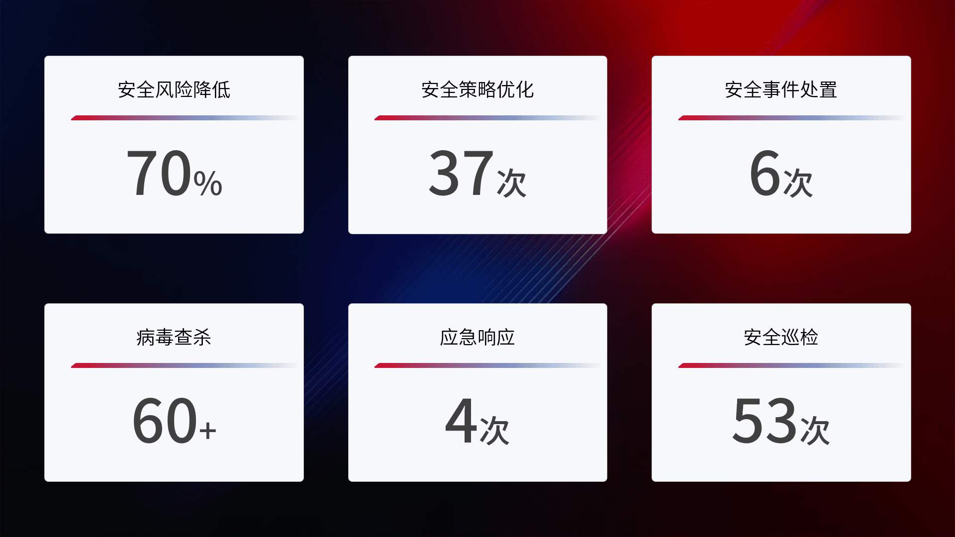 提供全面的安全事件报告体系,,,包括处置报告、、周报、、季度和年度总结,,,,结合持续监控,,帮助客户深入了解网络安全状况。。。